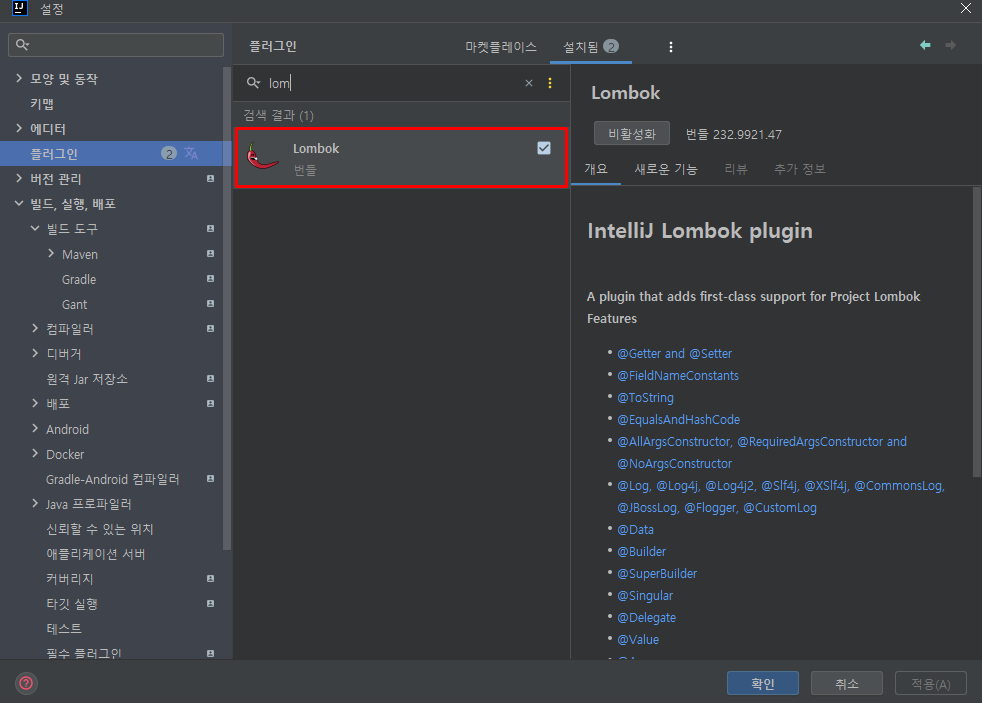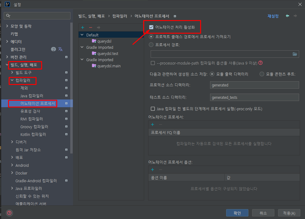 설정 -> 빌드 실행 배포 -> 컴파일러 -> 어노테이션 프로세서 -> 어노테이션 처리 활성화