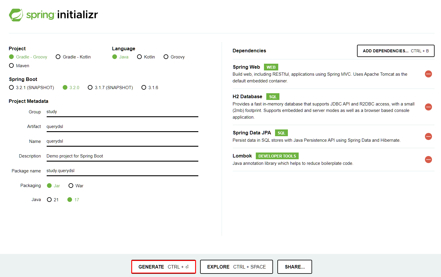 plugins { id 'java' id 'org.springframework.boot' version '3.2.0' id 'io.spring.dependency-management' version '1.1.4' } group = 'study' version = '0.0.1-SNAPSHOT' sourceCompatibility = '17' configurations { compileOnly { extendsFrom annotationProcessor } } repositories { mavenCentral() } dependencies { implementation 'org.springframework.boot:spring-boot-starter-data-jpa' implementation 'org.springframework.boot:spring-boot-starter-web' implementation 'com.github.gavlyukovskiy:p6spy-spring-boot-starter:1.9.0' compileOnly 'org.projectlombok:lombok' runtimeOnly 'com.h2database:h2' annotationProcessor 'org.projectlombok:lombok' testImplementation 'org.springframework.boot:spring-boot-starter-test' //JdbcTemplate 추가 //implementation 'org.springframework.boot:spring-boot-starter-jdbc' //MyBatis 추가 implementation 'org.mybatis.spring.boot:mybatis-spring-boot-starter:2.2.0' //JPA, 스프링 데이터 JPA 추가 implementation 'org.springframework.boot:spring-boot-starter-data-jpa' //test 롬복 사용 testCompileOnly 'org.projectlombok:lombok' testAnnotationProcessor 'org.projectlombok:lombok' //H2 데이터베이스 추가 runtimeOnly 'com.h2database:h2' compileOnly 'org.projectlombok:lombok' annotationProcessor 'org.projectlombok:lombok' testImplementation 'org.springframework.boot:spring-boot-starter-test' //Querydsl 추가 implementation 'com.querydsl:querydsl-jpa:5.0.0:jakarta' annotationProcessor "com.querydsl:querydsl-apt:${dependencyManagement.importedProperties['querydsl.version']}:jakarta" annotationProcessor "jakarta.annotation:jakarta.annotation-api" annotationProcessor "jakarta.persistence:jakarta.persistence-api" } tasks.named('test') { useJUnitPlatform() } clean { delete file('src/main/generated') }build.gradle을 설정하고 실행시 querydsl을 사용하기 위해 entity를 참조한 해당 엔티티가 생성됨