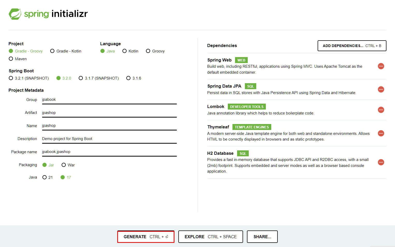 - 사용 기능: web, thymeleaf, jpa, h2, lombok,