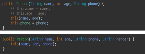 - 생성자에서 또 다른 생성자를 호출할 때 사용 가능 하다