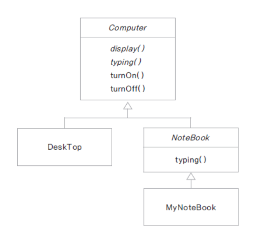 public abstract class Computer { public abstract void display(); public abstract void typing(); public void turnOn() { System.out.println("전원을 넣다"); } public void turnOff() { System.out.println("전원을 끄다"); } }- display와 typing은 추상메서드로 선언하여 자식클래스에서 재정의하여 사용